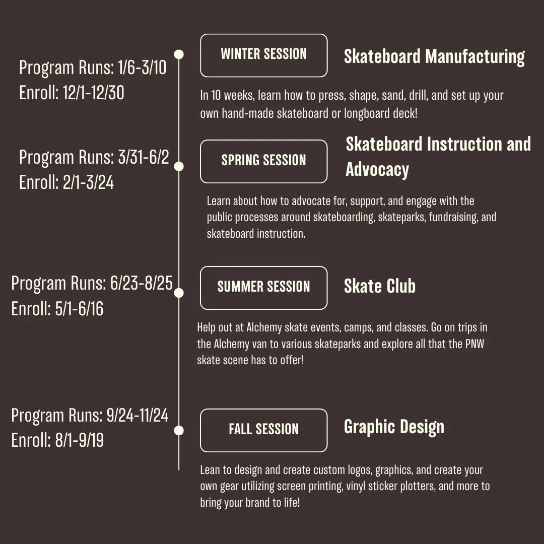 Bite 3: Skateboard Club - As an Alchemy Skate Ambassador, help out at Alchemy skate events, camps, and classes. Go on trips in the Alchemy van to various skateparks and explore all that the PNW skate scene has to offer! Participation in Bite 2 not required but strongly recommended.