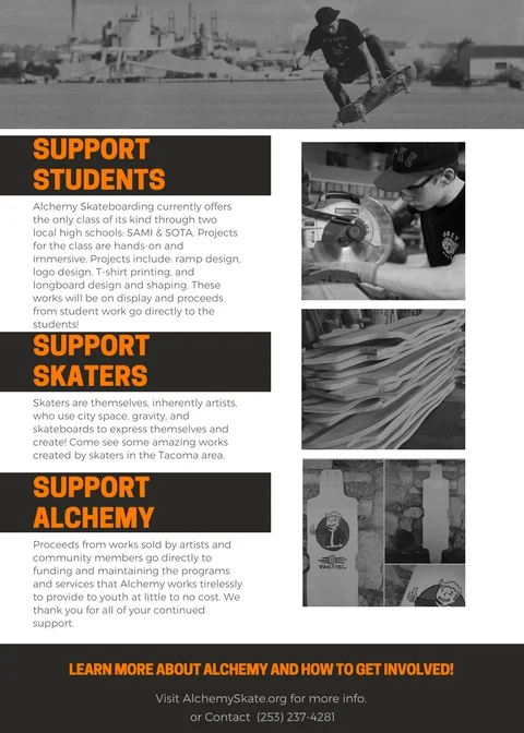 Held on Dec. 12th, 2015 at Crimson Wraps & Graphics; a benefit to raise money for the programs and operations at Alchemy Skateboarding. Participated in by over a dozen local artists who generously donated their time and talents to create amazing one of a kind board art. If you are interested in buying a piece to support Alchemy, contact us through our website.